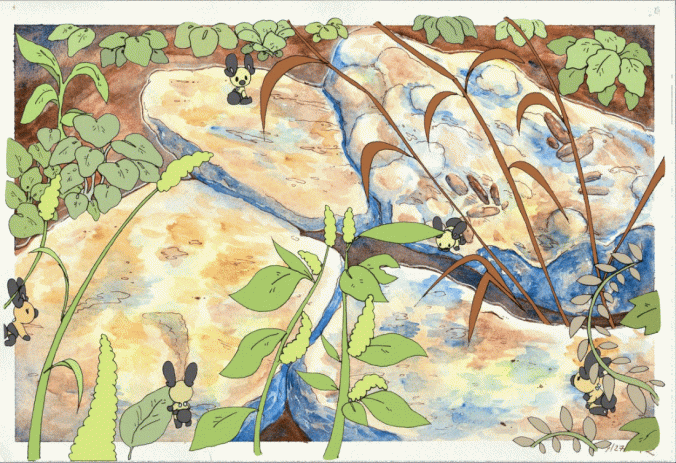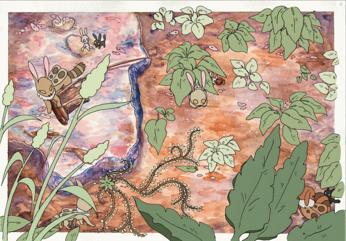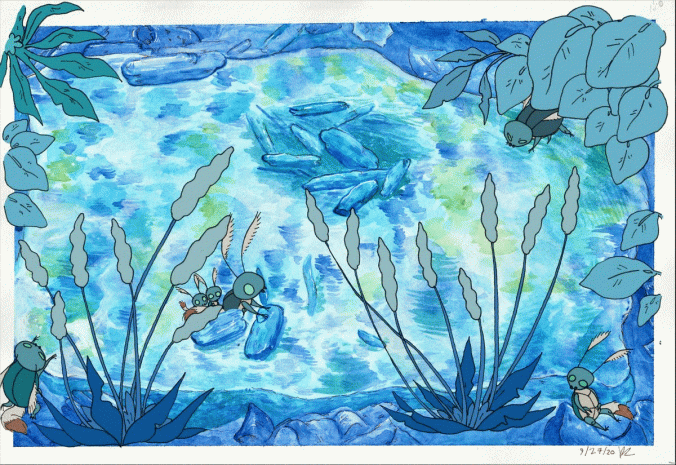 I made this as part of a series of four paintings for class. This one represents the season of Winter and features my original species the Kameshi. This was done in watercolors and computer paper, and edited together digitally.