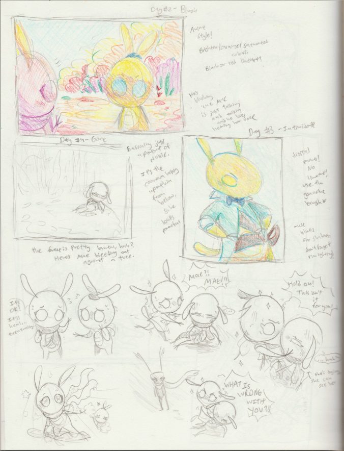 Some sketchbook stuff I did during OC-tober! Turns out making thumbnails actually help a lot with making finished pieces who could’ve guessed??
