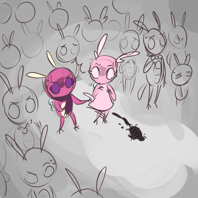 Early concept art of the scene where the plague infected bug Mae found jumps out of her hands to attack the queen.
